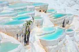 Pamukkale travertenləri, Türkiyə – Mineral suların illər boyu çöküntülər əmələ gətirməsi nəticəsində ağ təbəqələr və təbii termal hovuzlar yaranır. Bu təbii strukturlar yalnız turizm baxımından deyil, həm də hidrogeologiya və mineraloji tədqiqatlar üçün əhəmiyyətlidir.